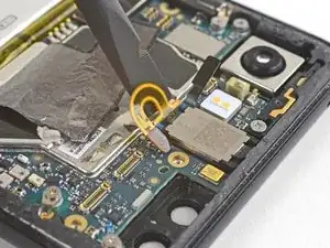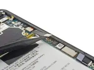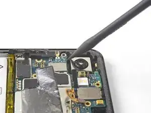 Используйте плоскую часть лопатки, чтобы аккуратно приподнять и отогнуть шлейф разговорного динамика вверх, убрав его с материнской платы.