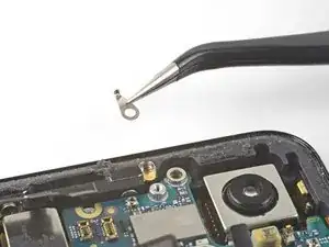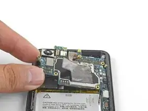 Возможно, будет трудно расположить материнскую плату вокруг шлейфа разговорного динамика. Можно аккуратно приподнять разговорный динамик, установить плату, затем снова установить разговорный динамик.
