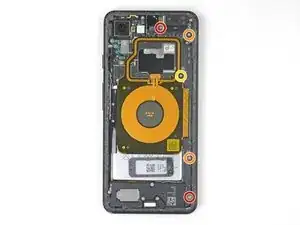 Удалите пять винтов Phillips, удерживающих катушку беспроводной зарядки: