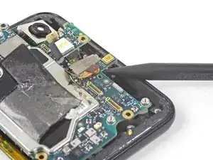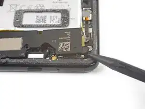 Используйте острый конец лопатки, чтобы приподнять и отключить разъём громкоговорителя от его гнезда на материнской плате возле правого края телефона.