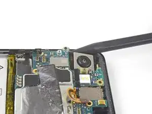 Вставьте острый конец лопатки рядом с верхним левым углом материнской платы, прямо под тыльной камерой.