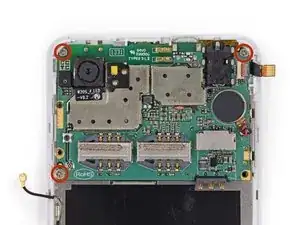 Удалите три винта Phillips #000 длиной 2.5 мм, которые крепят материнскую плату к сборке экрана.