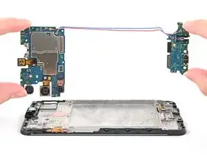 Возьмите материнскую и дочернюю платы за края и вытяните их вместе прямо вверх и наружу из телефона.