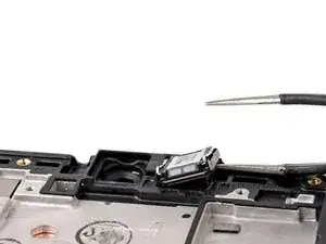 Используйте плоский конец лопатки, чтобы поддеть и отсоединить нажимной разъем кнопки отпечатка пальца от материнской платы.