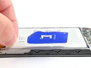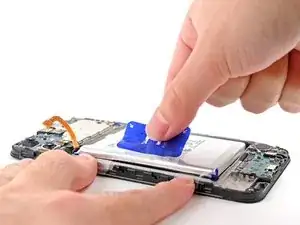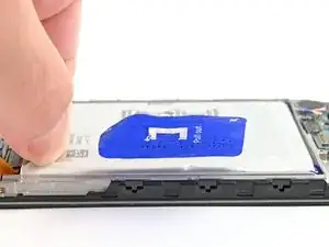 Сильной, равномерной тягой потяните за синюю тянущую ленту батареи, пока батарея не оторвётся от клея в телефоне.