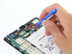 Используйте пластиковый инструмент для разборки, чтобы отсоединить зеленовато-золотой разъем верхнего динамика от материнской платы.