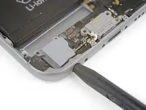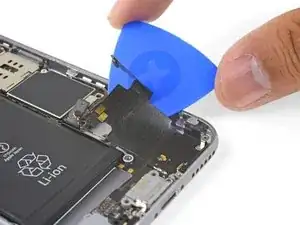Используйте острый конец лопаточки, чтобы приподнять и отсоединить ленточный кабель разъёма Lightning от его гнезда на плате логики.