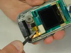 С помощью пинцета аккуратно отсоедините ленточный кабель дисплея от сборки экрана и телефона, подняв вверх оба соединения.