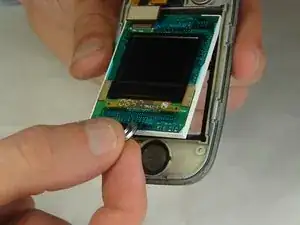 Ленточный кабель дисплея по-прежнему будет прикреплён к телефону через шарнир. Отключение ленточного кабеля дисплея на этом шаге необходимо для удаления экрана из сборки экрана.