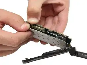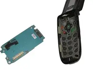 После удаления материнской платы от клавиатуры, сенсор клавиатуры можно отсоединить от телефона в районе петли.