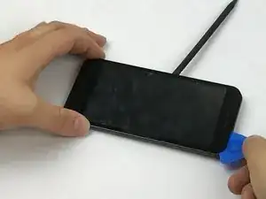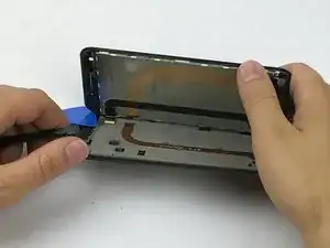 После удаления клея по всей кромке вставьте медиатор между экраном и корпусом, оставьте лопатки внутри, чтобы создать зазор для медиатора.