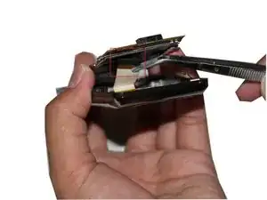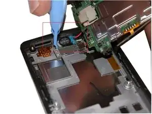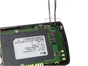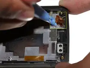 ЖК-экран подключён к нижней части платы. Подняв плату, используйте пинцет или безопасный поддевной инструмент, чтобы отключить ленточный кабель от ЖК-экрана к плате.