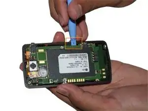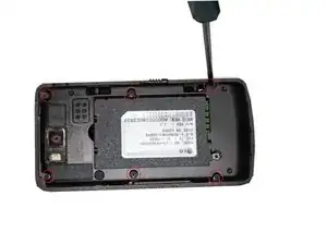Вставьте инструмент для безопасного поддевания в зазор между передней рамкой экрана и корпусом аккумулятора, чтобы снять корпус аккумулятора.