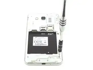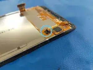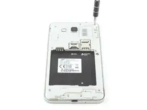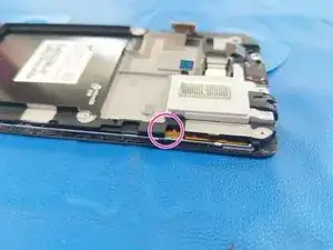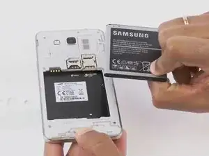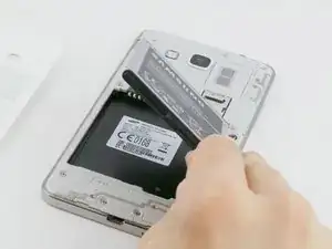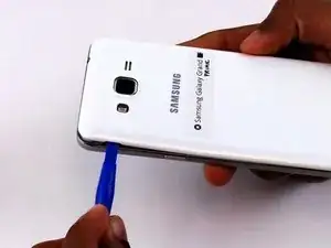 Снимите заднюю крышку телефона, поддев язычок задней крышки синей пластиковой лопаткой для вскрытия.
