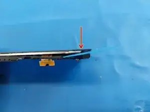 В правом углу аккуратно покачивайте медиатором вверх и вниз, чтобы дополнительно разъединить клей, затем вставьте его, как показано, между ЖК-дисплеем и рамкой.