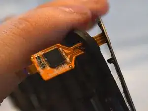 Отключите этот ленточный кабель, откинув чёрную защёлку слева (относительно фотографии) вверх и вправо, затем аккуратно выведите ленточный кабель.
