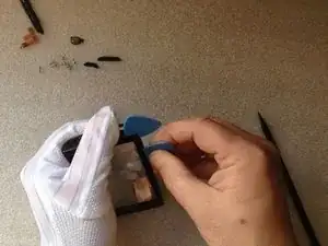 Аккуратно сделайте зазор между стеклом и рамкой при помощи резака, чтобы вставить туда пластиковую лопатку.
