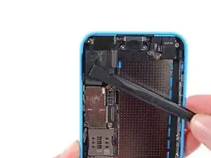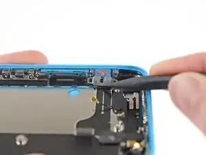 Кабель разъёма Lightning слегка приклеен к экрану на плате. Используйте плоский конец лопатки, чтобы аккуратно отслоить кабель.