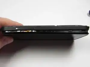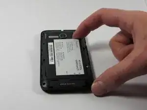 Поместите палец на выемку в правом верхнем углу аккумулятора, указанную чёрной стрелкой. Слегка надавив, подтолкните аккумулятор вниз и выньте его из отсека до полного извлечения.