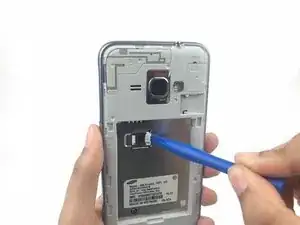 Используя пластиковый инструмент, приподнимите углубление слева от камеры, чтобы снять заднюю крышку.
