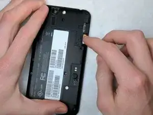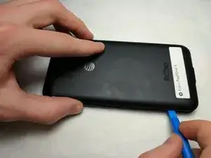 Вставьте наконечник синего пластикового инструмента для вскрытия в щель между задней крышкой и корпусом телефона и подденьте крышку вверх.