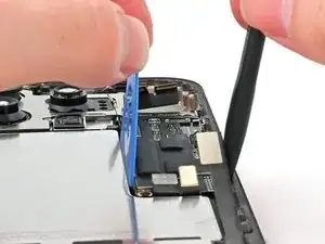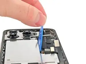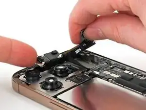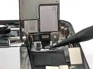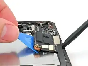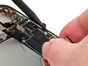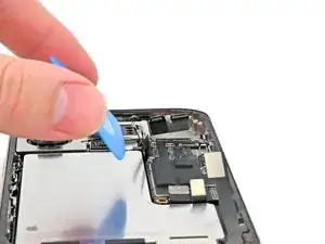 Кончиком лопатки подденьте и отсоедините разъёмы динамика-приёмника и антенны 5G mmWave, расположенные в правом верхнем углу платы.