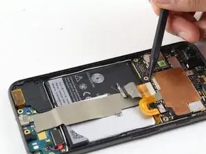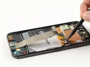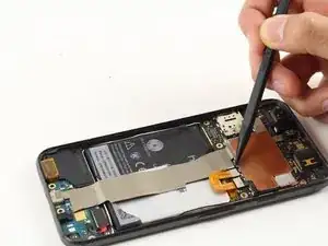 С помощью лопатки отсоедините тонкий чёрный шлейф, соединяющий кнопки питания и регулировки громкости с материнской платой.