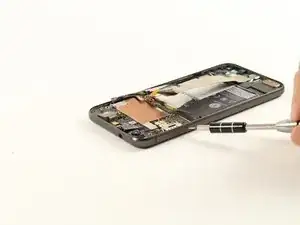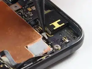 При сборке заново подсоедините шлейф разговорного динамика и установите верхнюю сторону средней рамки перед тем, как защёлкнуть фиксаторы на место.