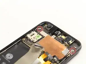 Выверните два серебристых винта T5 длиной 2,5 мм, удерживающих материнскую плату на месте.
