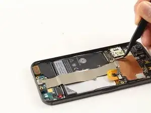 Используйте пинцет, чтобы приподнять клеящую полоску в верхней части аккумулятора и отогнуть её, чтобы открыть доступ к разъёму под ней.