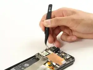 Чтобы снова подключить эти кабели, используйте пинцет, чтобы аккуратно разместить каждый кабель над его гнездом на плате, затем нажмите прямо вниз, пока он не защёлкнется на месте.