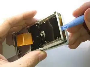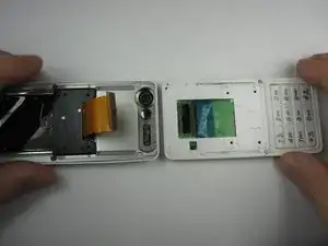 Между двумя половинами находится шлейф. Используйте пластиковый инструмент для открытия, чтобы поднять защелку и отключить его.