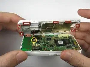 Отцепите восемь зажимов, фиксирующих заднюю крышку к остальной части телефона, как показано на втором фото.