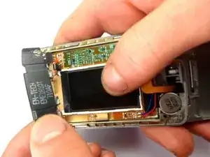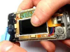 Найдите слуховой динамик, который является черным компонентом вверху с черными и красными проводами.