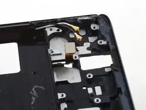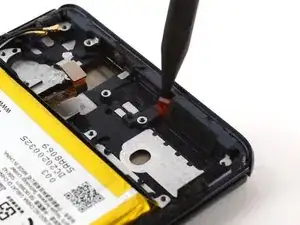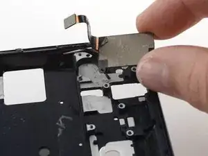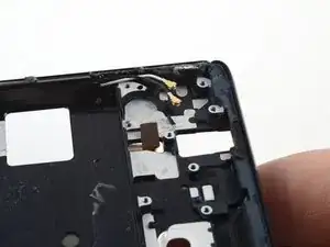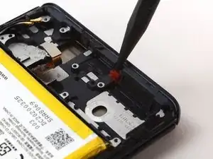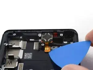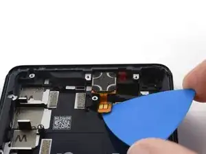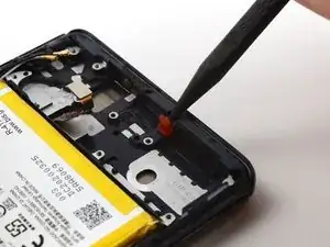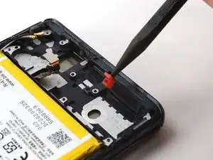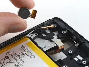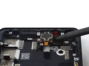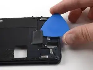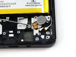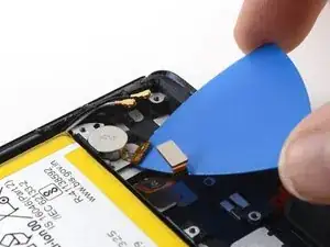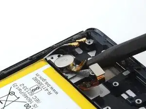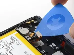 Используйте монтажную лопатку, чтобы аккуратно отделить гибкий кабель вибромотора от рамки телефона.