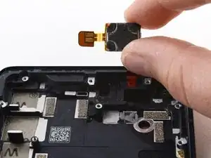 Переверните телефон и снимите средний каркас, аккуратно протягивая шлейф экрана через отверстие в каркасе.