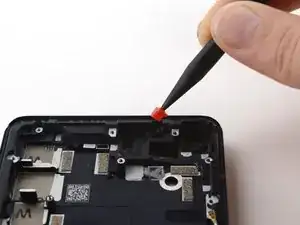 С помощью лопаточки приподнимите пластиковую крышку дочерней платы и отсоедините её от остальной части телефона.