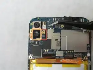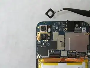 Вверху слева от материнской платы под камерой используйте пинцет, чтобы отключить пресс-фит коннектор, находящийся справа от стабилизатора.