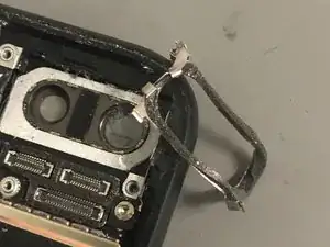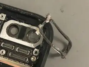 Удалить эту нижнюю скобу сложно. Внутренний круглый край этой скобы, похоже, припаян к кольцу объектива камеры; поэтому потребуется значительно больше усилий, и не удивительно, если скоба полностью сломается.