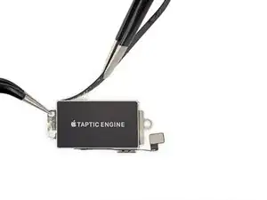 Контактная защёлка на левой стороне Taptic Engine может оторваться. Убедитесь, что она установлена правильно, как показано, перед повторной установкой Taptic Engine в iPhone.