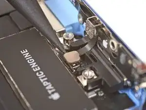 С помощью лопатки отсоедините гибкий кабель Taptic Engine, поддев его и отводя прямо вверх из гнезда.
