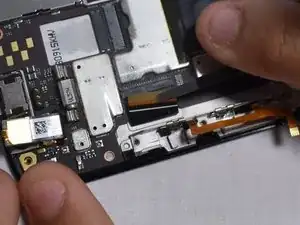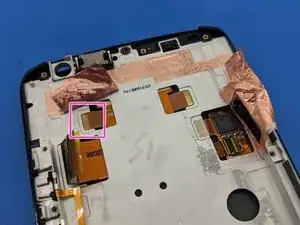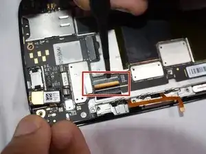 С помощью кончика лопатки отсоедините эту защёлку шлейфа дисплея от рамки.