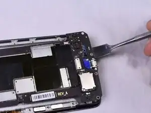 Используя медиатор, приподнимите серую защёлку на ZIF-разъёме модуля задней камеры. Снимите шлейф и камеру.