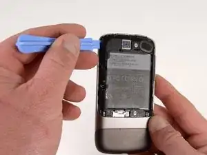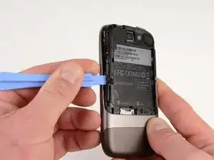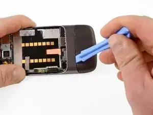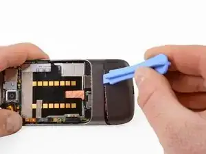 Используя пластиковое приспособление, подденьте вверх корпус аккумулятора.