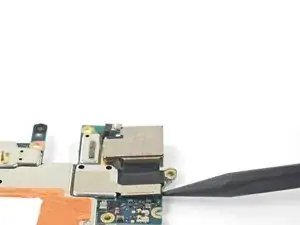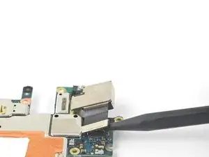 Используйте плоскость лопатки, чтобы аккуратно отогнуть шлейф слухового динамика вверх, чтобы он не мешал материнской плате.