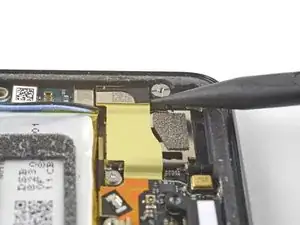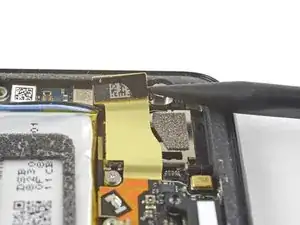 Используйте плоский конец лопатки, чтобы аккуратно отлепить чёрную ленту, держущую шлейф дисплея на месте, у правого края телефона.