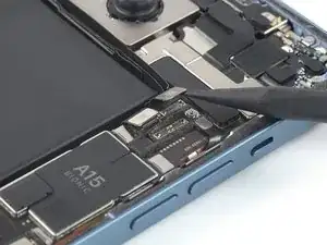 Возьмите крышку разъёма аккумулятора пинцетом и сдвиньте её вверх (в сторону маркировки A15), чтобы отщёлкнуть верхний крючок.