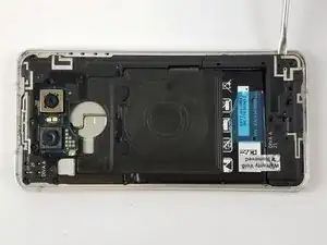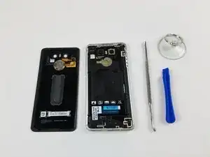 Когда задняя панель прогрета, прикрепите присоску близко к углу телефона. Поднимите и вставьте лопатку или медиатор под заднее стекло.