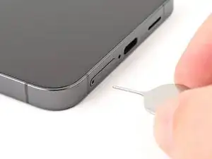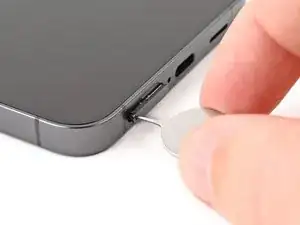 Вставьте инструмент для извлечения SIM‑лотка, насадку или распрямлённую скрепку в отверстие лотка SIM на нижнем торце телефона.