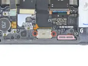 Используйте крестовую отвёртку Phillips, чтобы выкрутить два винта 2,9 мм, удерживающие порт USB-C в телефоне.